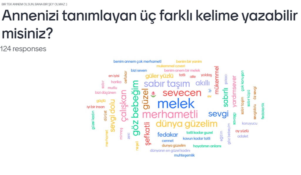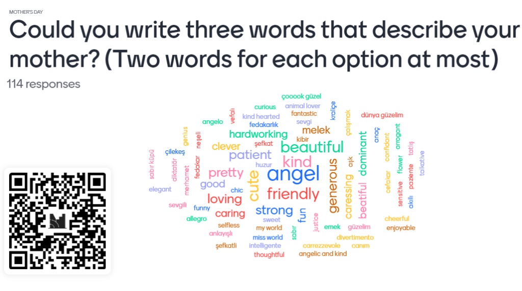 Mentimeter programında oluşturduğumuz bir anketle projedeki öğrencilerimizden annelerini tanımlayan üç kelime yazmalarını istedik. Ortaya çıkan kelime bulutlarımızda daha büyük yazılan kelimeler en çok tekrarlanan kelimelerdir.